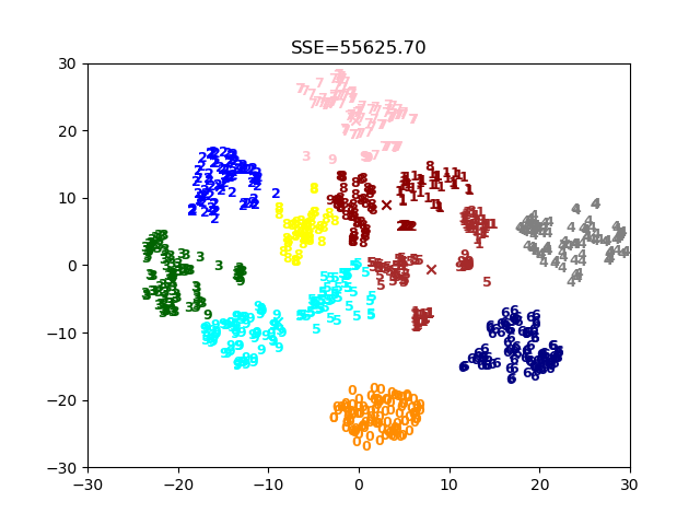 采用类似的方法,可以编写代码,运行sklearn包中其他的聚类算法。 下面我们看一个稍微复杂的例子,采用二分Kmeans算法对经典手写数字MNIST数据库进行聚类分析。